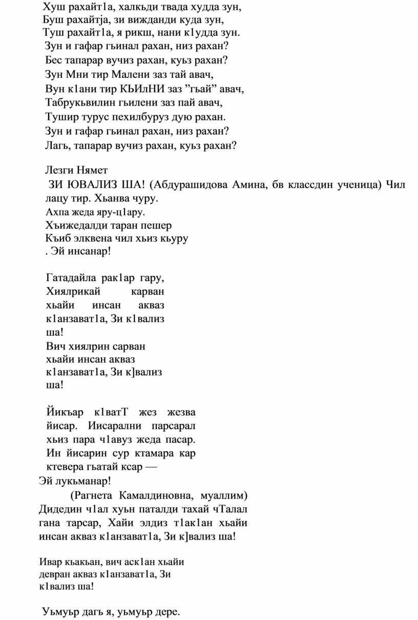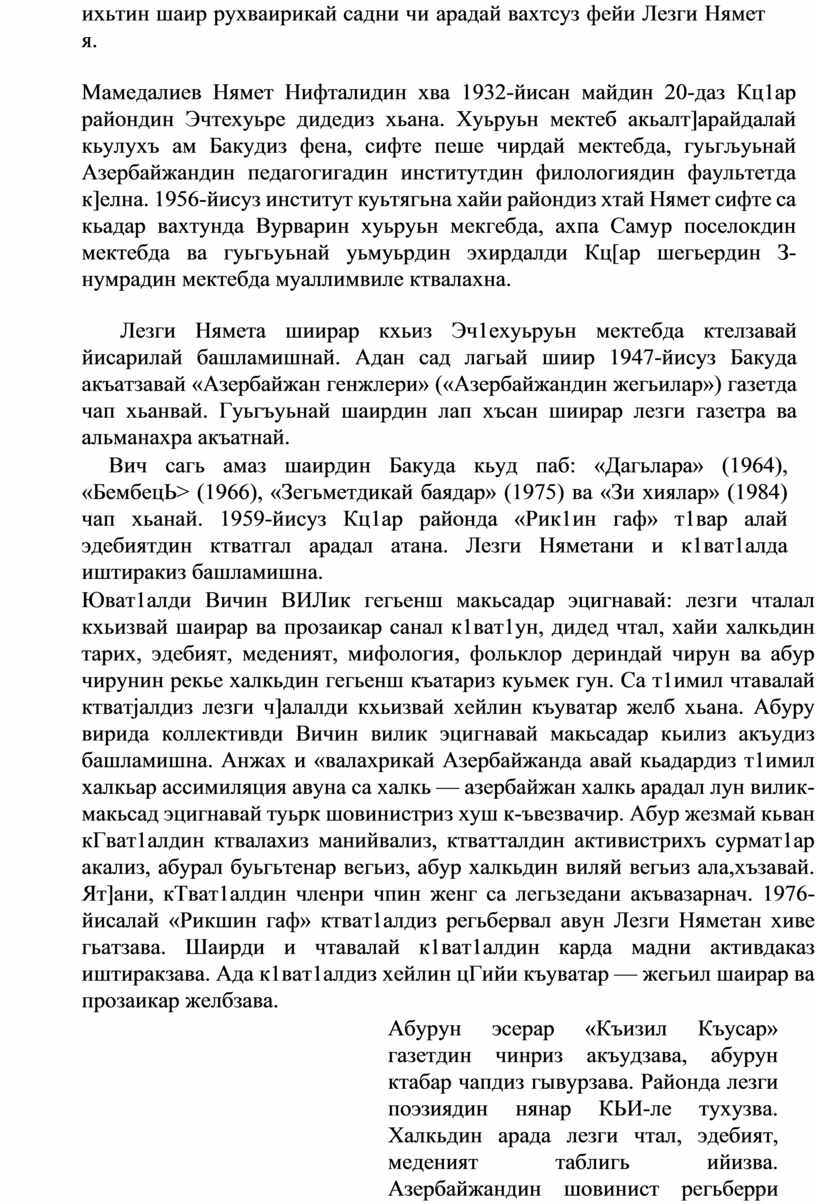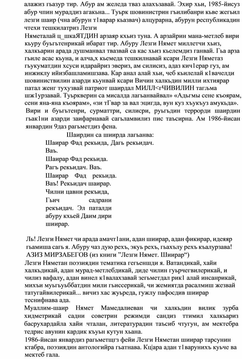 Ль! Лезги Нямет чи арада амачт1ани, адан шиирар, адан фикирар, идеяяр гьамиша сагь я. Абуру чаз дую рехъ, экуь рехъ, гьахълу рехъ къалурзава! АЗИЗ МИРЗАБЕГОВ (из книги ”Лезги Нямет. Шиирар“)