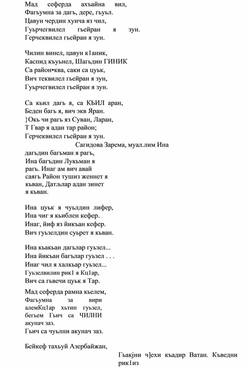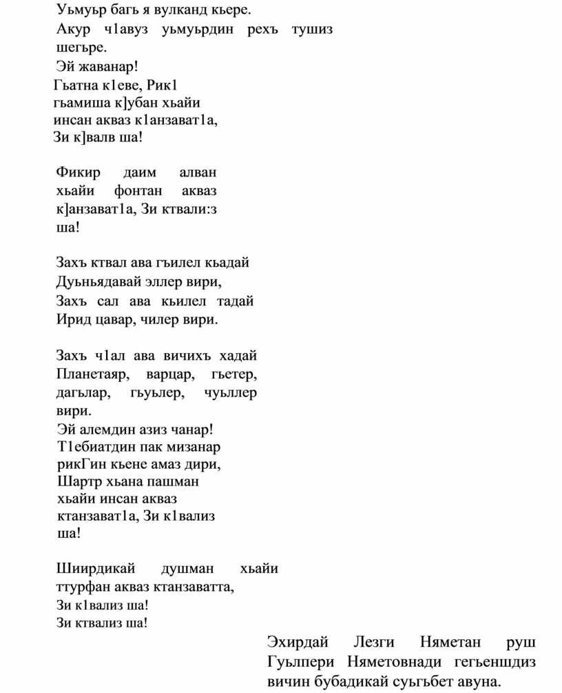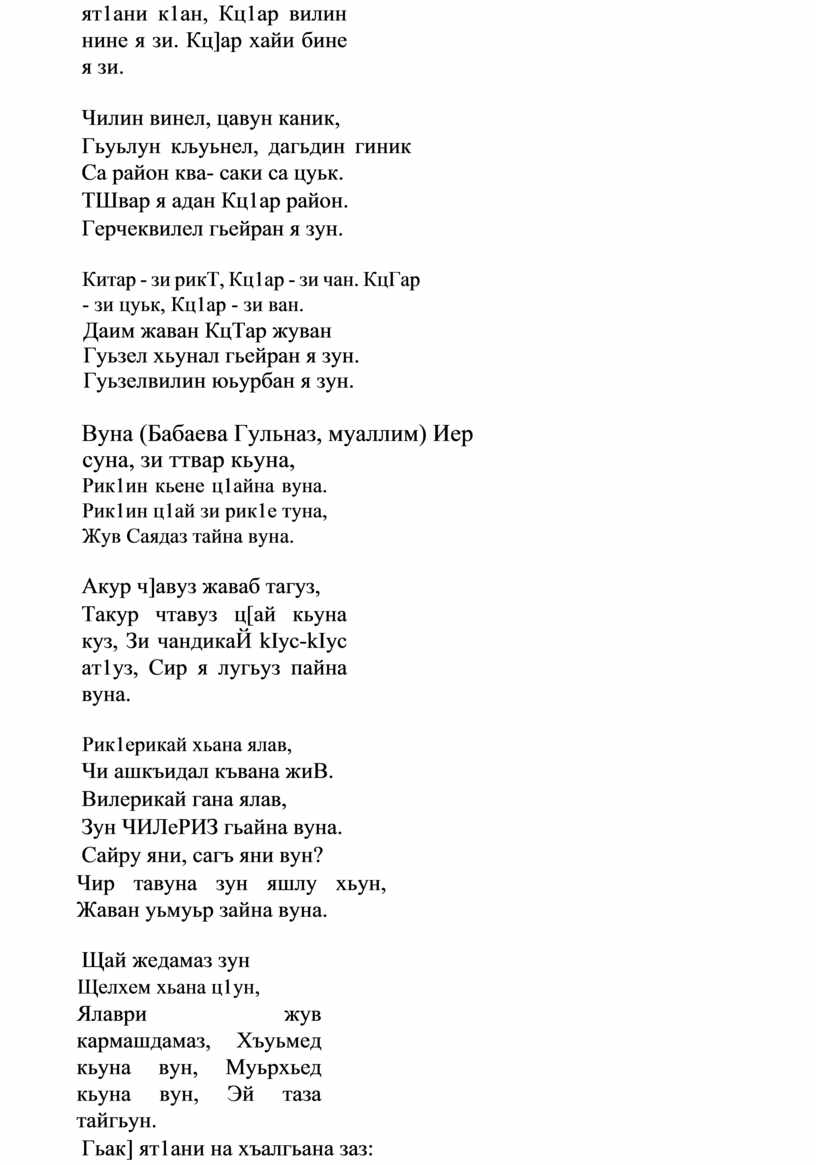 Гьакјни ч]ехи къадир Ватан. Къведни рик1из ят1ани к1ан, Кц1ар вилин нине я зи. Кц]ар хайи бине я зи.