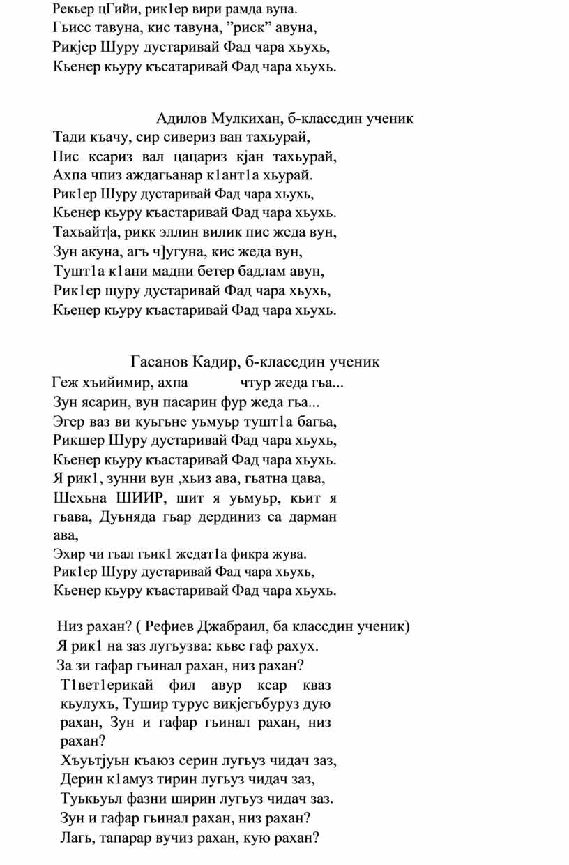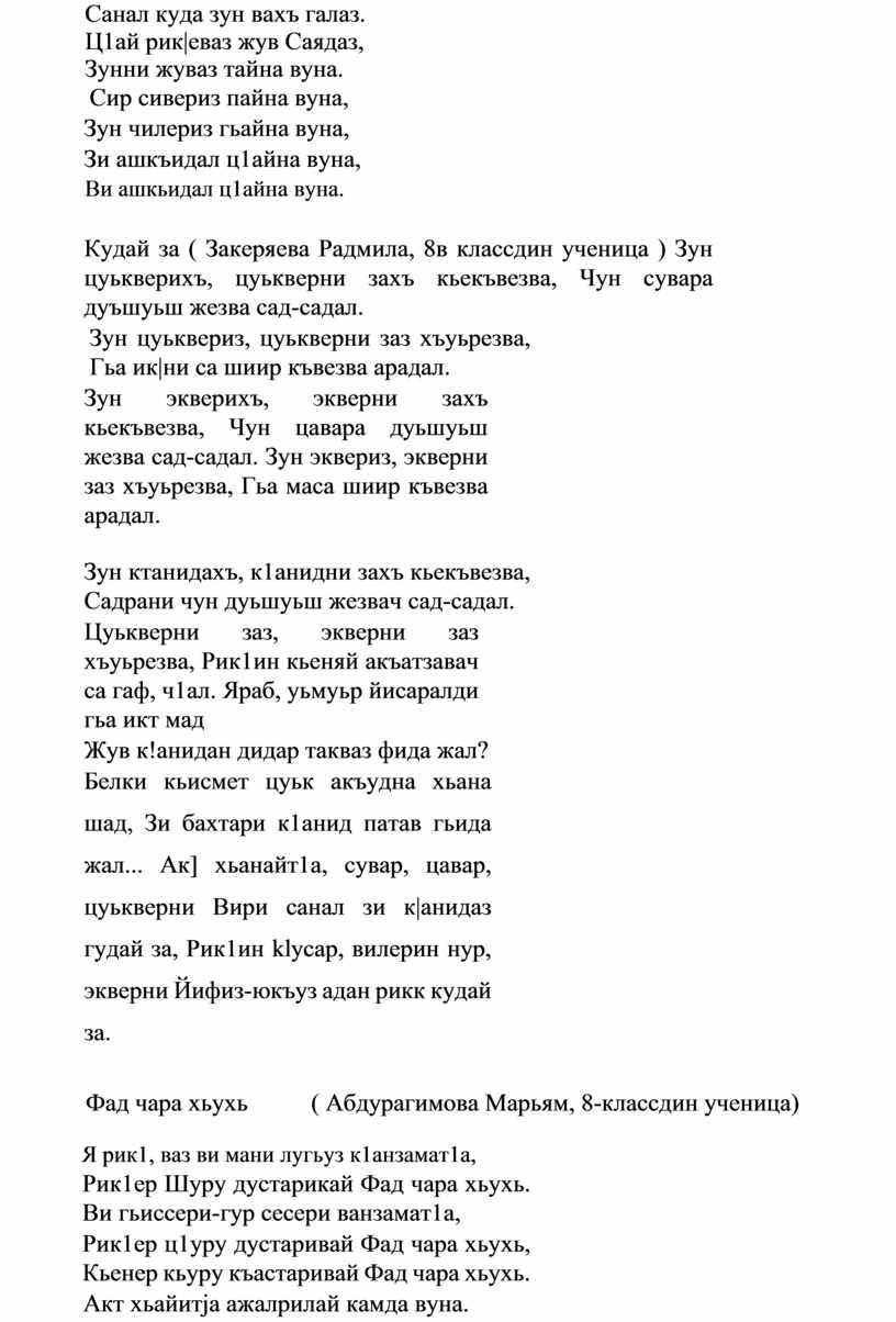 Кудай за ( Закеряева Радмила, 8в классдин ученица ) Зун цуькверихъ, цуькверни захъ кьекъвезва, Чун сувара дуъшуьш жезва сад-садал.