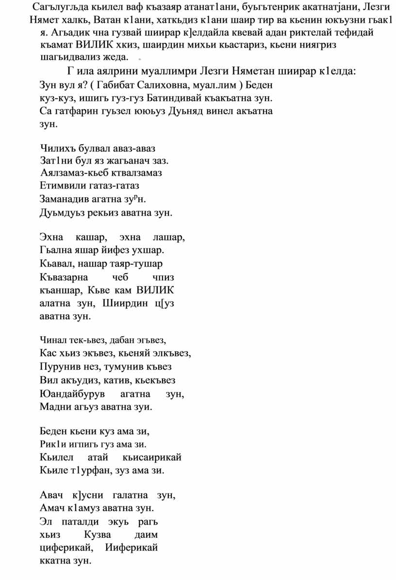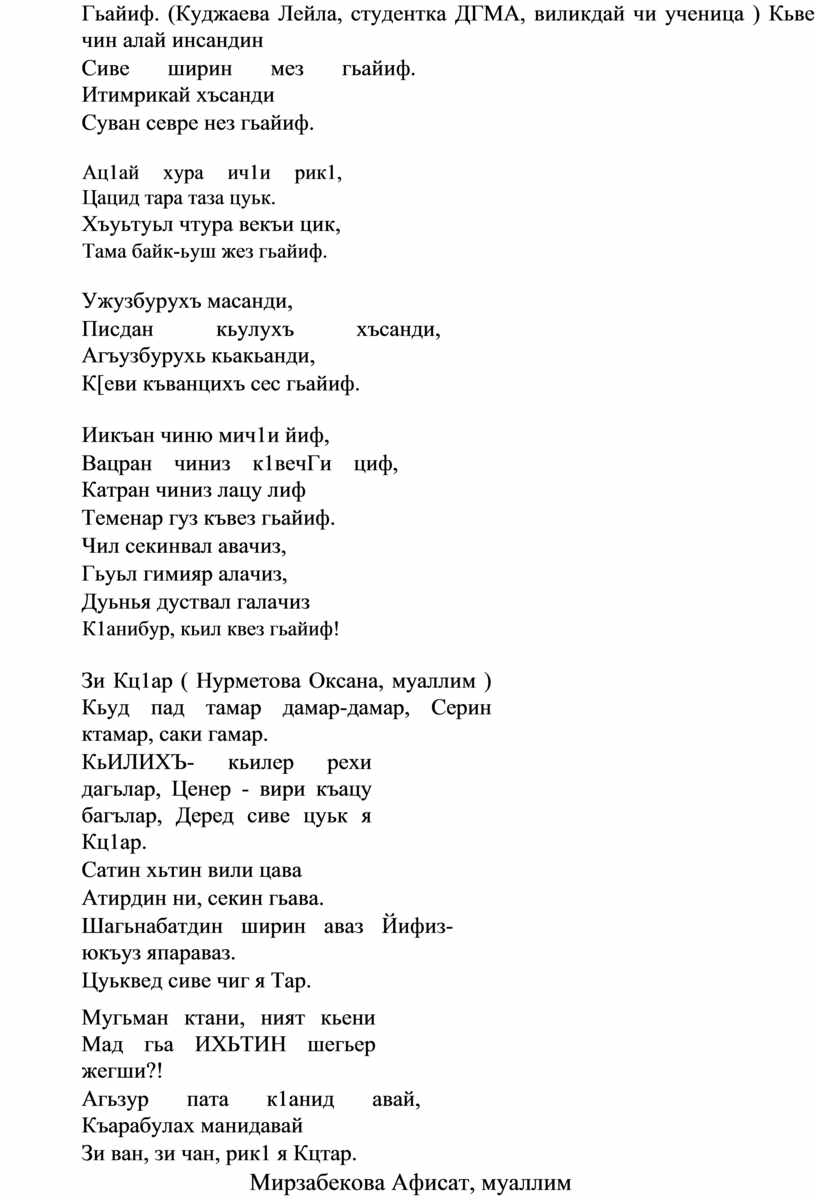 Зун вул я? ( Габибат Салиховна, муал.лим ) Беден куз-куз, ишигь гуз-гуз Батиндивай къакъатна зун. Са гатфарин гуьзел ююьуз Дуьняд винел акъатна зун.