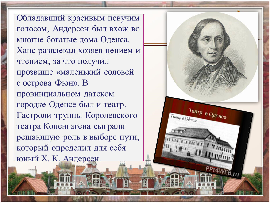 Обладавший красивым певучим голосом, Андерсен был вхож во многие богатые дома Оденса. Ханс развлекал хозяев пением и чтением, за что получил прозвище «маленький соловей с острова Фюн». В провинциальном датском городке Оденсе был и театр. Гастроли труппы Королевского театра Копенгагена сыграли решающую роль в выборе пути, который определил для себя юный Х. К. Андерсен.