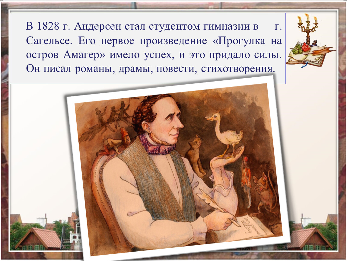 В 1828 г. Андерсен стал студентом гимназии в г. Сагельсе. Его первое произведение «Прогулка на остров Амагер» имело успех, и это придало силы. Он писал романы, драмы, повести, стихотворения.