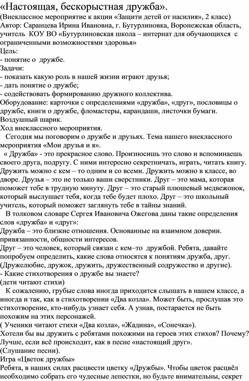 « Дружба» - это прекрасное слово. Произносишь это слово и вспоминаешь своего друга, подругу. С ними интересно секретничать, играть, читать книгу. Дружить можно с кем – то одним и со всеми. Дружить можно в классе, во дворе. Друзья – это не только ваши сверстники. Друг – это мама, которая поможет тебе в трудную минуту. Друг – это старый плюшевый медвежонок, который выслушает тебя, когда тебе будет плохо. Друг – это школьный учитель, который поможет заглянуть тебе в тайны знаний.