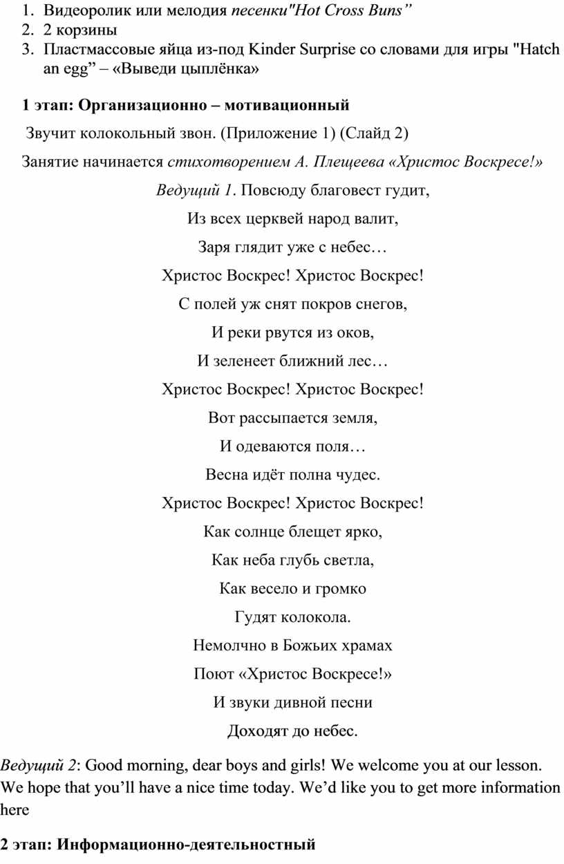 Занятие начинается стихотворением А. Плещеева «Христос Воскресе!»