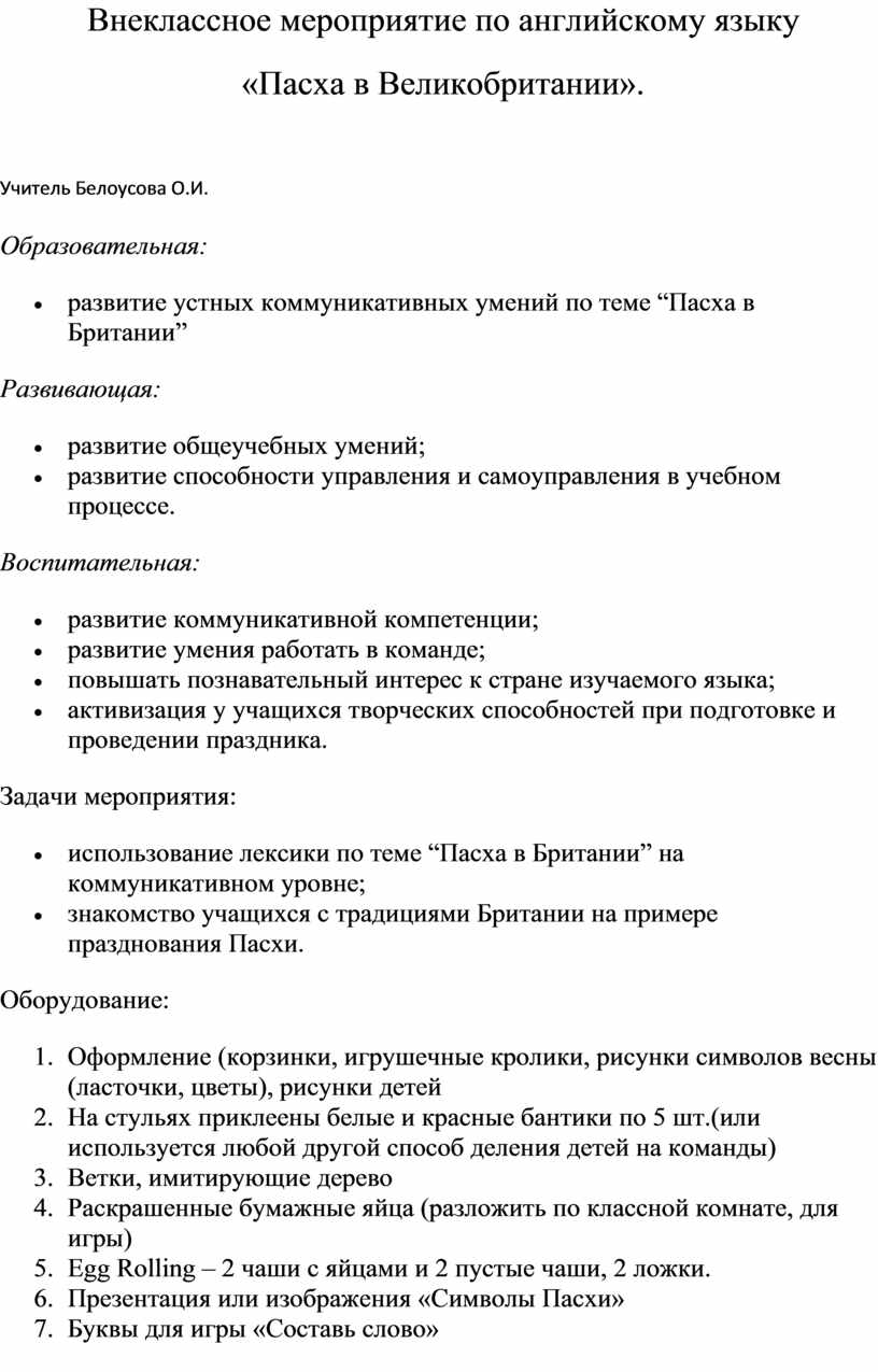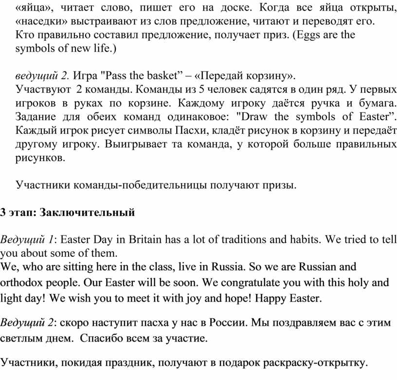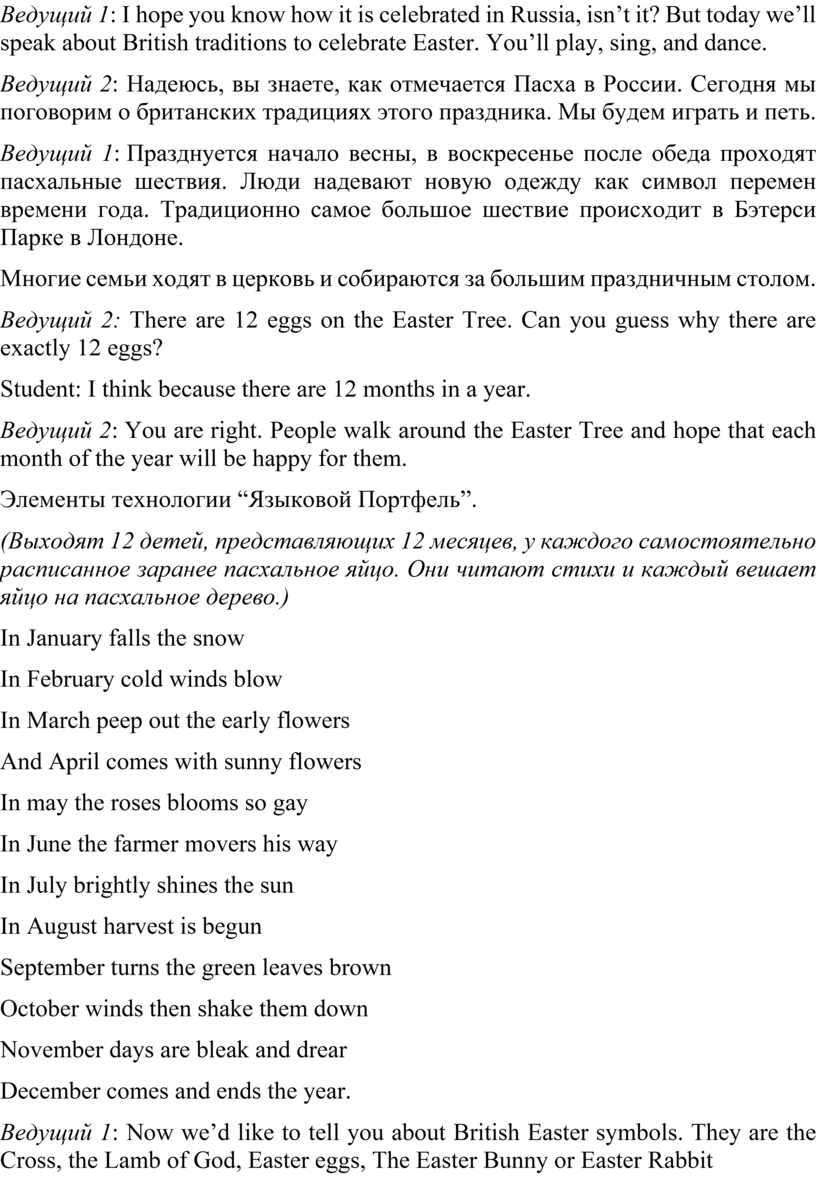 Ведущий 1: I hope you know how it is celebrated in Russia, isn’t it? But today we’ll speak about British traditions to celebrate Easter. You’ll play, sing, and dance.