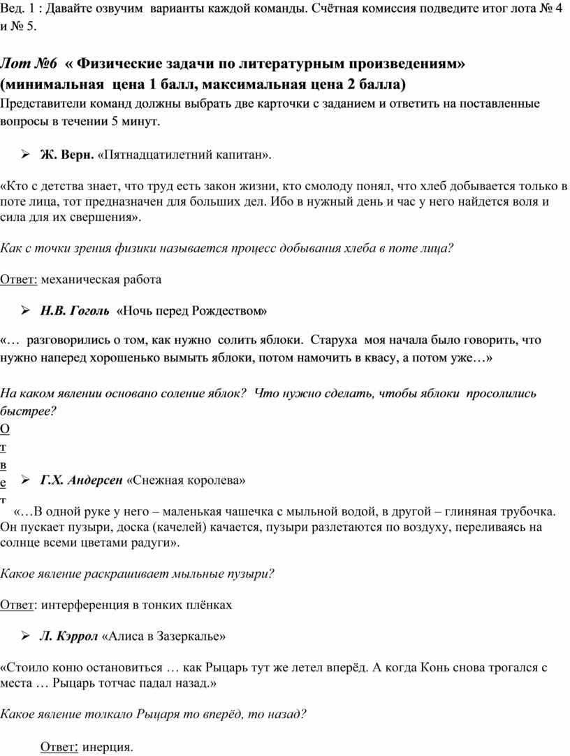 Лот №6 « Физические задачи по литературным произведениям» (минимальная цена 1 балл, максимальная цена 2 балла)
