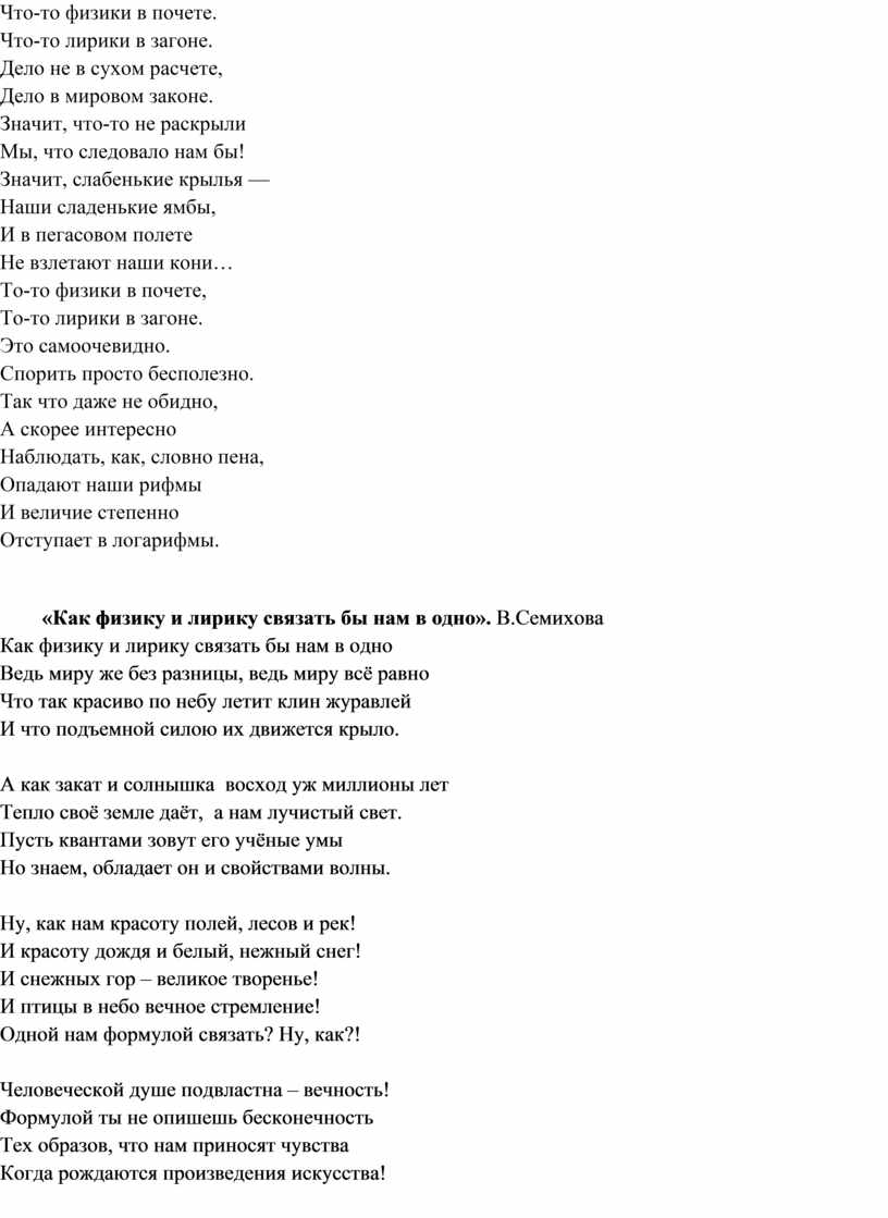 физику и лирику связать бы нам в одно». В.Семихова