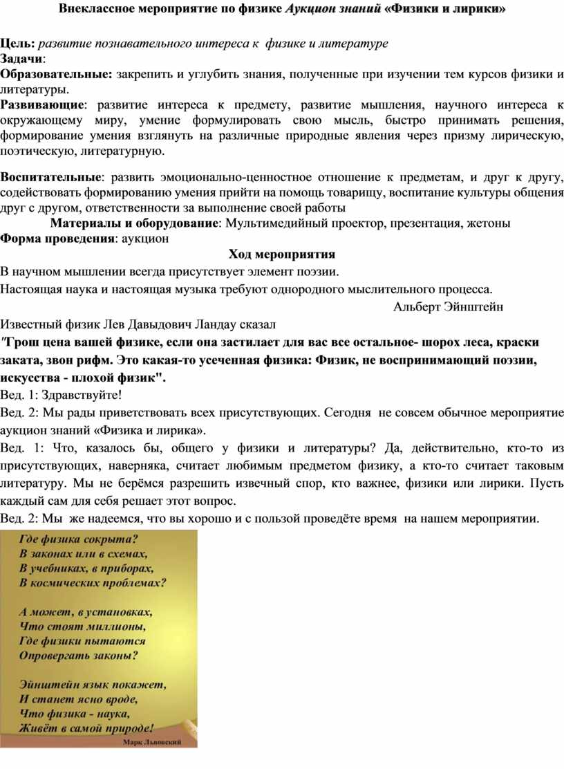 Внеклассное мероприятие по физике Аукцион знаний «Физики и лирики»