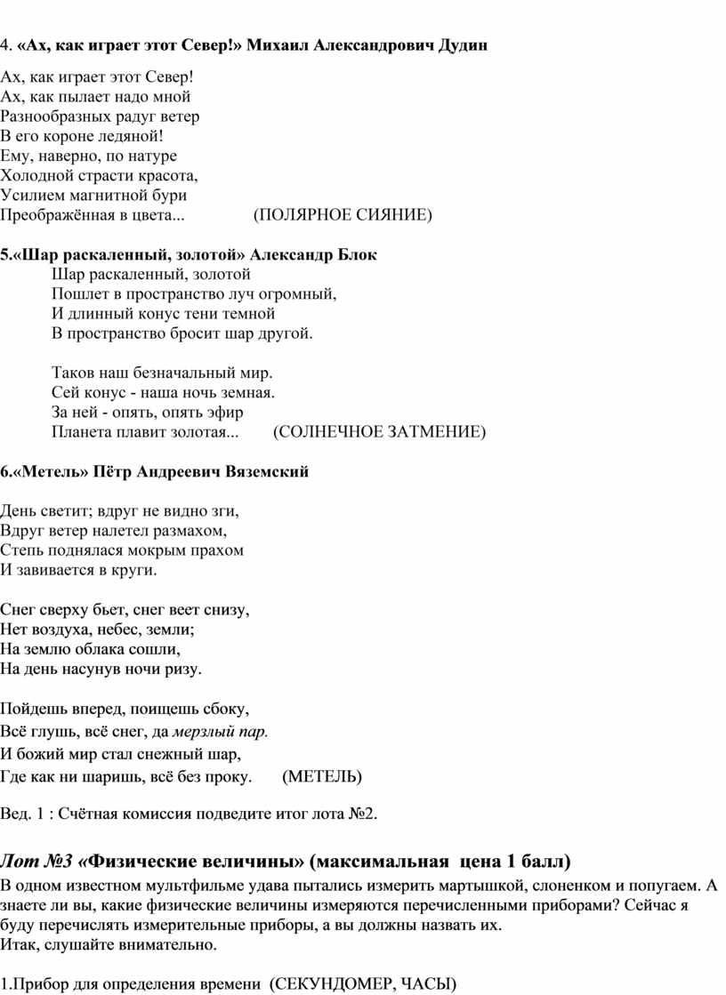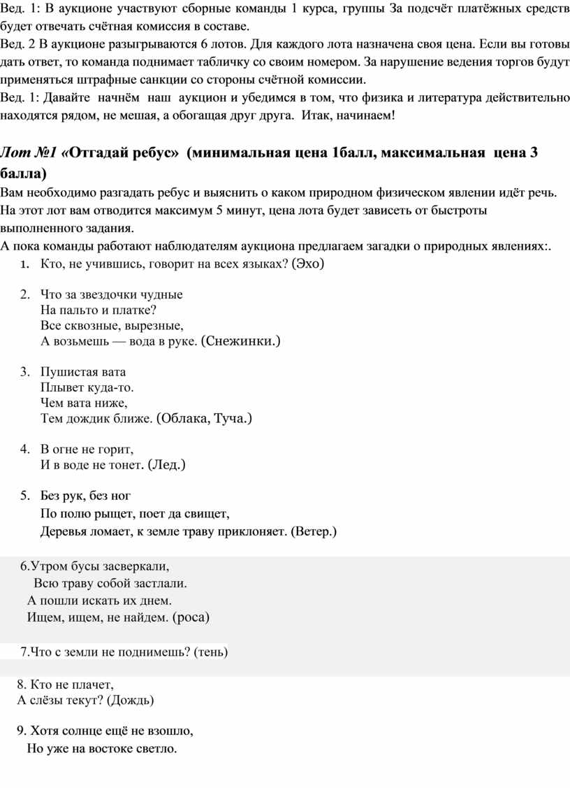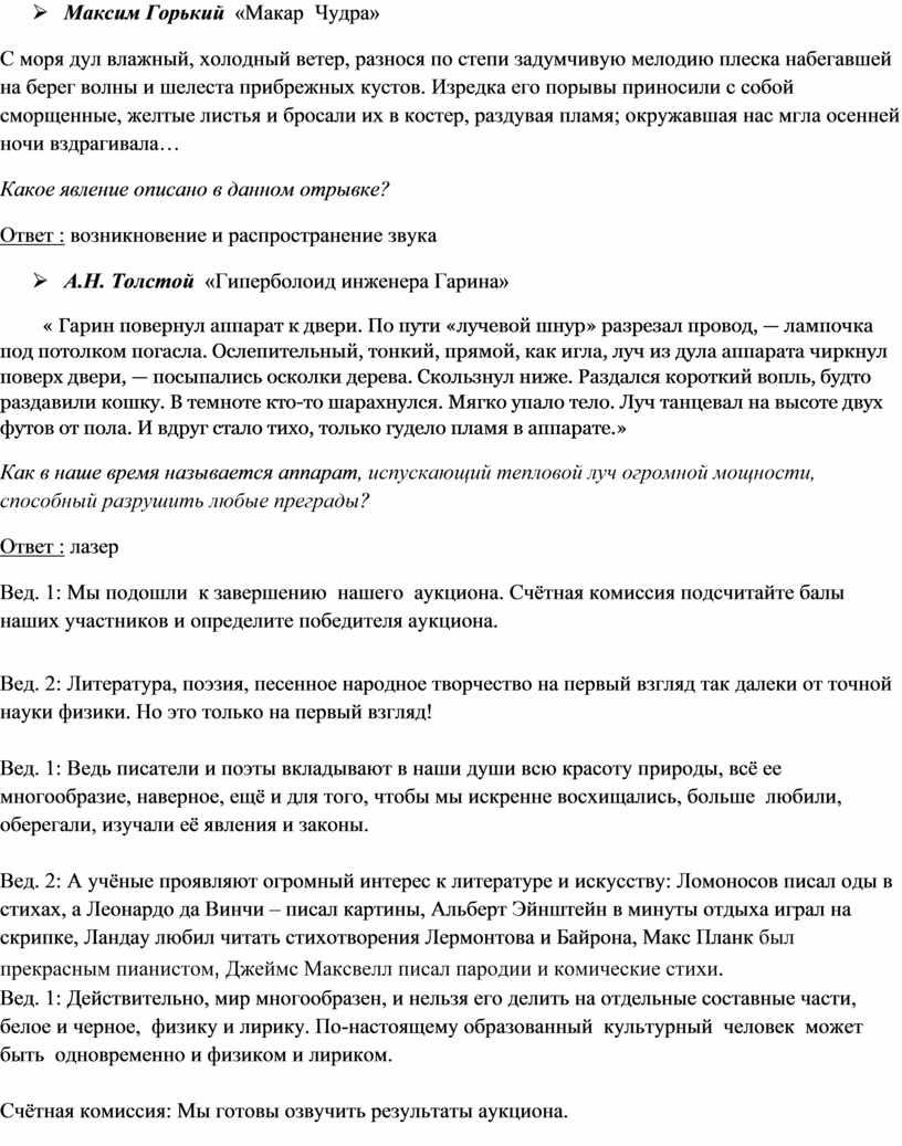 Вед. 1: Давайте начнём наш аукцион и убедимся в том, что физика и литература действительно находятся рядом, не мешая, а обогащая друг друга. Итак, начинаем!