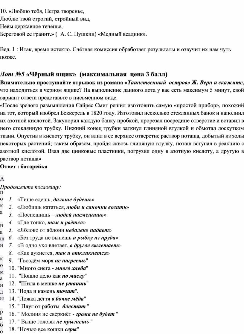 Вед. 1 : Итак, время истекло. Первыми отгадали ребус команда № ….., ваш ответ. Вторыми команда №…., третьими команда №….. Счётная комиссия подведите итог лота №1.