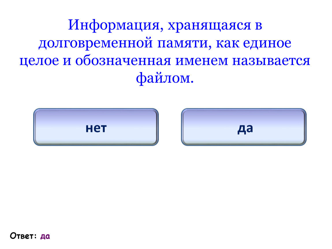 Информация, хранящаяся в долговременной памяти, как единое целое и обозначенная именем называется файлом.
