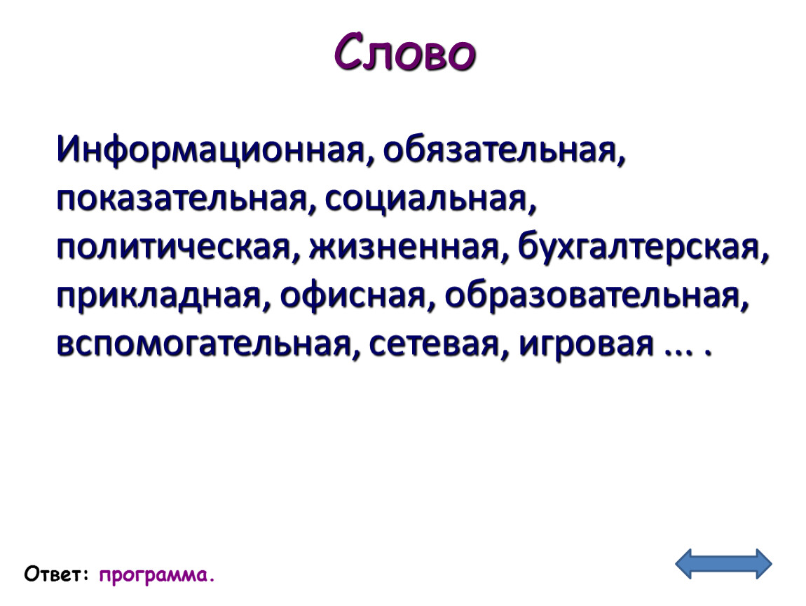 Информационная, обязательная, показательная, социальная, политическая, жизненная, бухгалтерская, прикладная, офисная, образовательная, вспомогательная, сетевая, игровая ... .