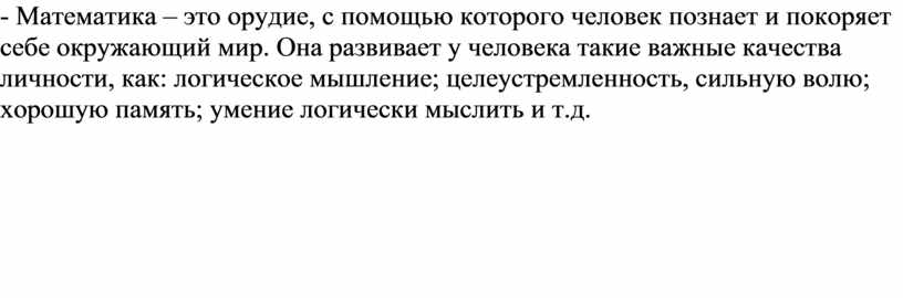 - Математика – это орудие, с помощью которого человек познает и покоряет себе окружающий мир. Она развивает у человека такие важные качества личности, как: логическое мышление; целеустремленность, сильную волю; хорошую память; умение логически мыслить и т.д.