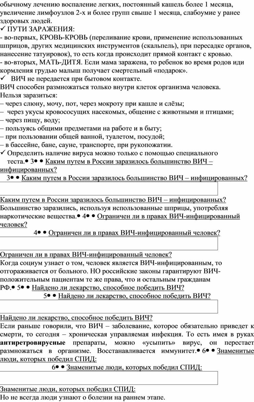 Интересные и важные факты: ü ВИЧ хорошо прячется. С момента заражения ВИЧ до развития СПИДа может пройти 15 лет. Человек хорошо себя чествует, живет обычной жизнью. Показания для обследования на ВИЧ-инфекцию являются: лихорадка более 1 месяца, понос более 1 месяца, необъяснимая потеря массы тела на 10% и более, затяжное, повторяющееся или не поддающееся обычному лечению воспаление легких, постоянный кашель более 1 месяца, увеличение лимфоузлов 2-х и более групп свыше 1 месяца, слабоумие у ранее здоровых людей. ü ПУТИ ЗАРАЖЕНИЯ: - во-первых, КРОВЬ-КРОВЬ (переливание крови, применение использованных шприцов, других медицинских инструментов (скальпель), при пересадке органов, нанесение татуировок), то есть когда происходит прямой контакт с кровью. - во-вторых, МАТЬ-ДИТЯ. Если мама заражена, то ребенок во время родов иди кормления грудью малыш получает смертельный «подарок». ü ВИЧ не передается при бытовом контакте. ВИЧ способен размножаться только внутри клеток организма человека. Нельзя заразиться: – через слюну, мочу, пот, через мокроту при кашле и слёзы; – через укусы кровососущих насекомых, общение с животными и птицами; – через пищу, воду; – пользуясь общими предметами на работе и в быту; – при пользовании общей ванной, туалетом, посудой; – в бассейне, бане, сауне, транспорте, при рукопожатии. ü Определить наличие вируса можно только с помощью специального теста. |