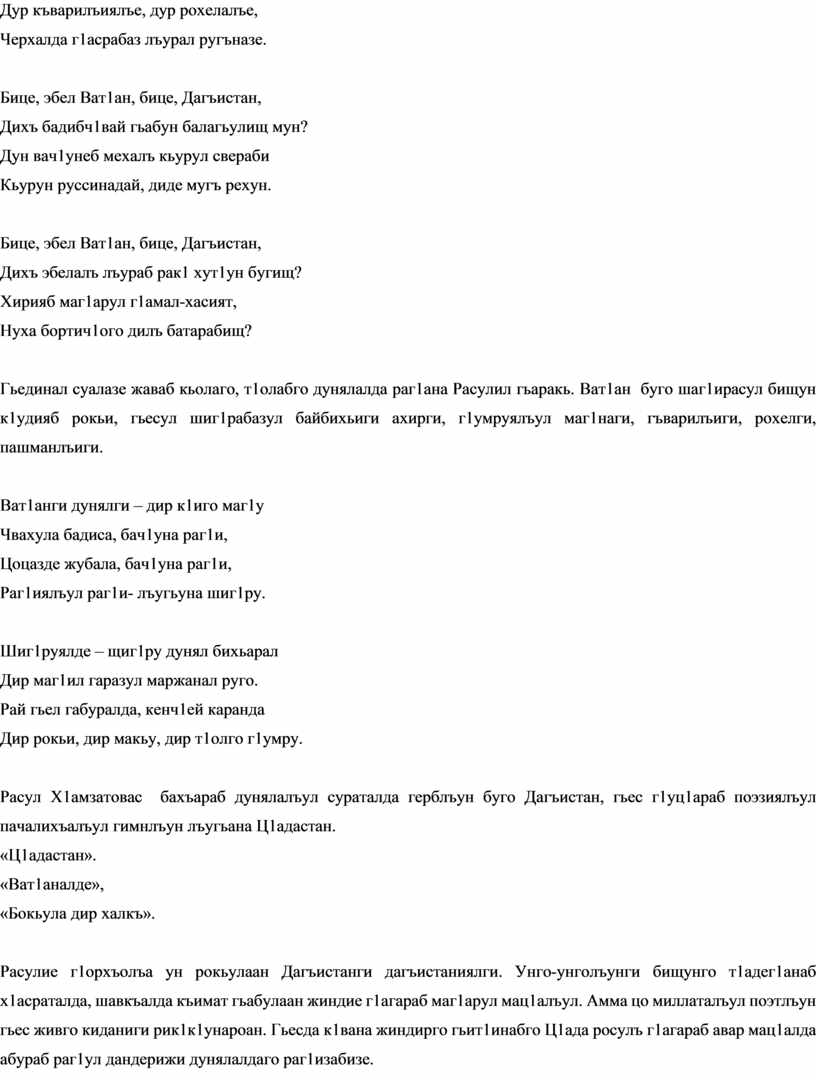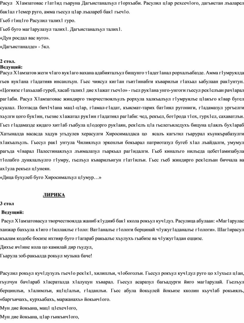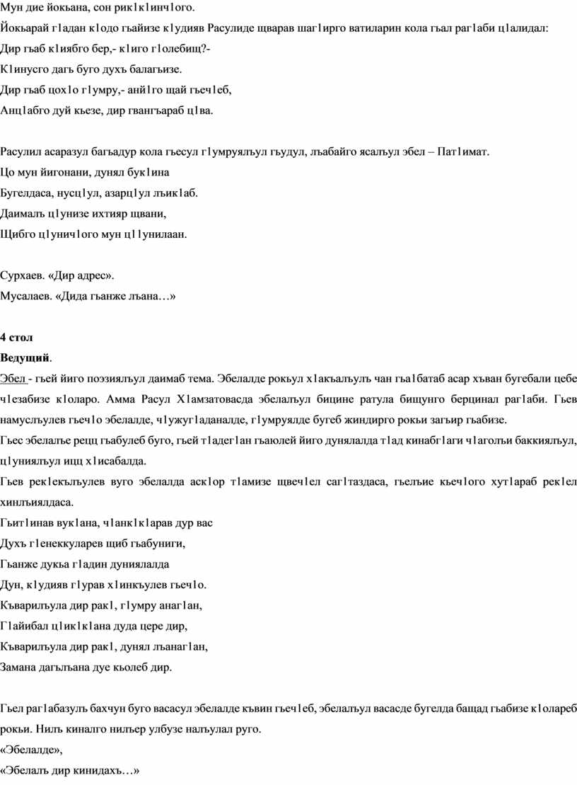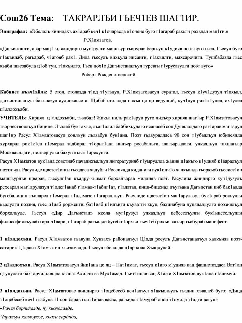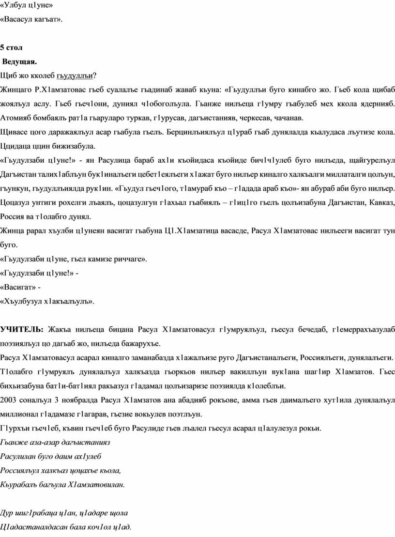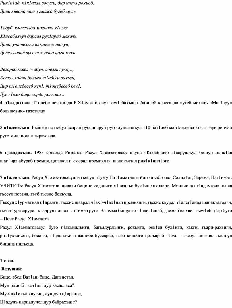 УЧИТЕЛЬ: Хириял ц1алдохъаби, гьалбал! Жакъа нилъ рак1арун руго нилъер хирияв шаг1ир Р.Х1амзатовасул творчествоялъул бицине. Лъалеб бук1ахъе, лъаг1алил байбихьудаго исанасеб сон Дунялалдаго раг1арав маг1арул шаг1ир Расул Х1амзатовасул сонлъун лъазабун бук1ана. Поэт гьавуралдаса 90 сон т1убаялъул юбилеялда хурхарал рик1к1ен г1емерал тадбирал т1орит1ана нилъер росабалъги, шагьараздаги, улкаялъул тахшагьар Москваялдаги, нилъер улка бахун къват1ирехунги.