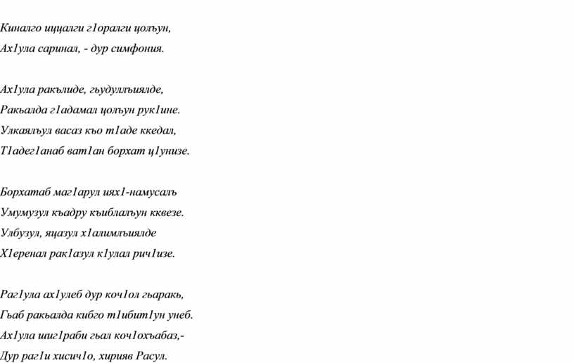 Расул Х1амзатовасул буго г1акъиллъиги, багьадурлъиги, рокьиги, рек1ел бух1иги, какги, гьари-рахьиги, рит1ухълъиги, божиги, г1аданлъиги жанибе буссараб, гьеб кинабго цолъараб т1ехь – гьесул поэзия. Гьелъул бицина нилъеца.