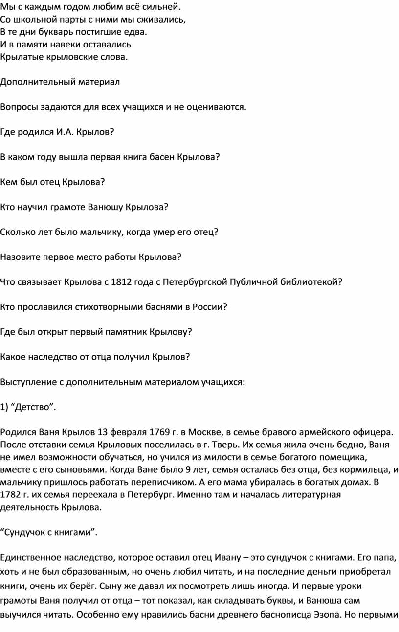 Родился Ваня Крылов 13 февраля 1769 г. в Москве, в семье бравого армейского офицера. После отставки семья Крыловых поселилась в г. Тверь. Их семья жила очень бедно, Ваня не имел возможности обучаться, но учился из милости в семье богатого помещика, вместе с его сыновьями. Когда Ване было 9 лет, семья осталась без отца, без кормильца, и мальчику пришлось работать переписчиком. А его мама убиралась в богатых домах. В 1782 г. их семья переехала в Петербург. Именно там и началась литературная деятельность Крылова.