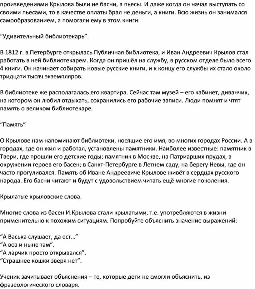 О Крылове нам напоминают библиотеки, носящие его имя, во многих городах России. А в городах, где он жил и работал, установлены памятники. Наиболее известные: памятник в Твери, где прошли его детские годы; памятник в Москве, на Патриарших прудах, в окружении героев его басен; в Санкт-Петербурге в Летнем саду, на берегу Невы, где он часто прогуливался. Память об Иване Андреевиче Крылове живёт в сердцах русского народа. Его басни читают и будут с удовольствием читать ещё многие поколения.