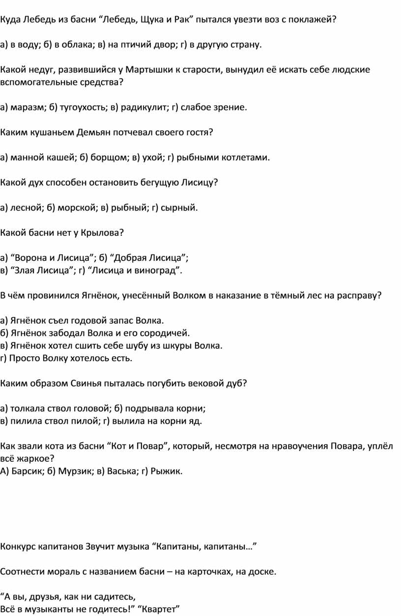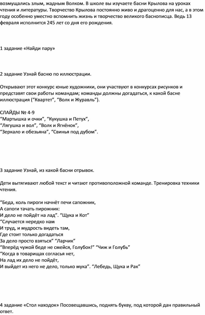 Список басен, которые необходимо прочитать к мероприятию: “Добрая Лисица”, “Лисица и виноград”, “Ворона и Лисица”, “Лебедь, Щука и Рак”, “Мартышка и очки”, “Слон и Моська”, “Зеркало и Обезьяна”, “Стрекоза и Муравей”, “Чиж и Голубь”, “Квартет”, “Ларчик”, “Мартышка и очки”, “Кукушка и Петух”, “Лягушка и вол”, “Волк и Ягнёнок”, “Зеркало и обезьяна”, “Свинья под дубом”, “Волк и Журавль”, “Щука и Кот”, “Петух и жемчужное зерно”.