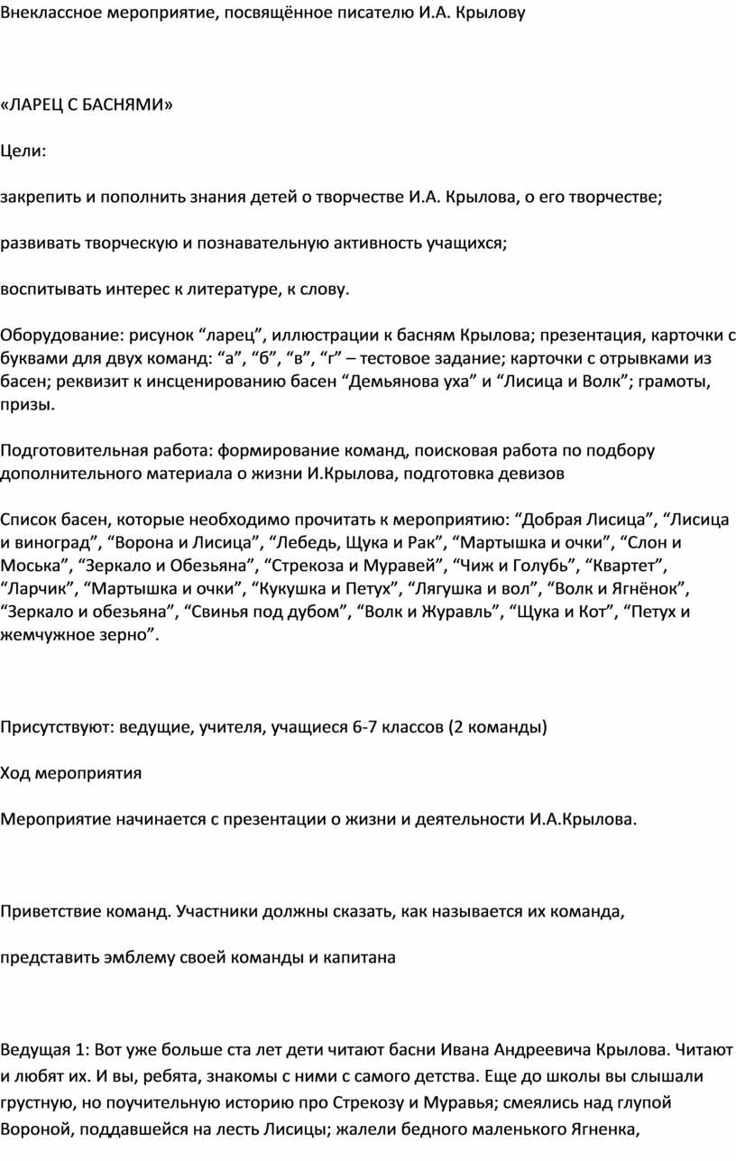 Оборудование: рисунок “ларец”, иллюстрации к басням Крылова; презентация, карточки с буквами для двух команд: “а”, “б”, “в”, “г” – тестовое задание; карточки с отрывками из басен; реквизит к инсценированию басен “Демьянова уха” и “Лисица и Волк”; грамоты, призы.