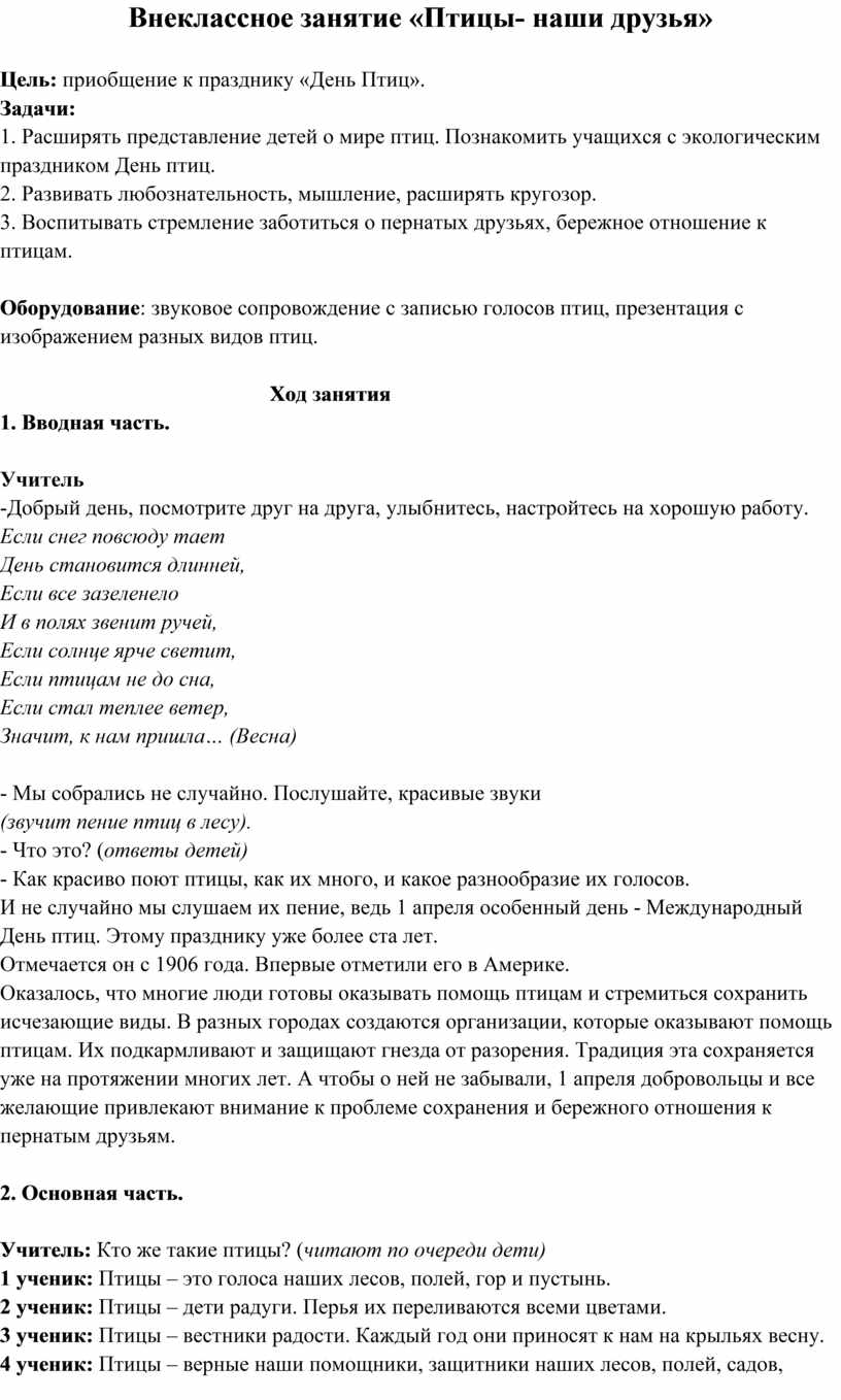Внеклассное занятие «Птицы- наши друзья»