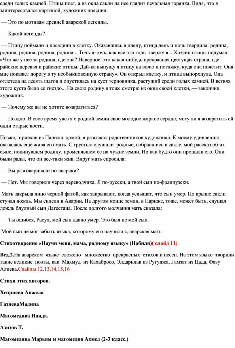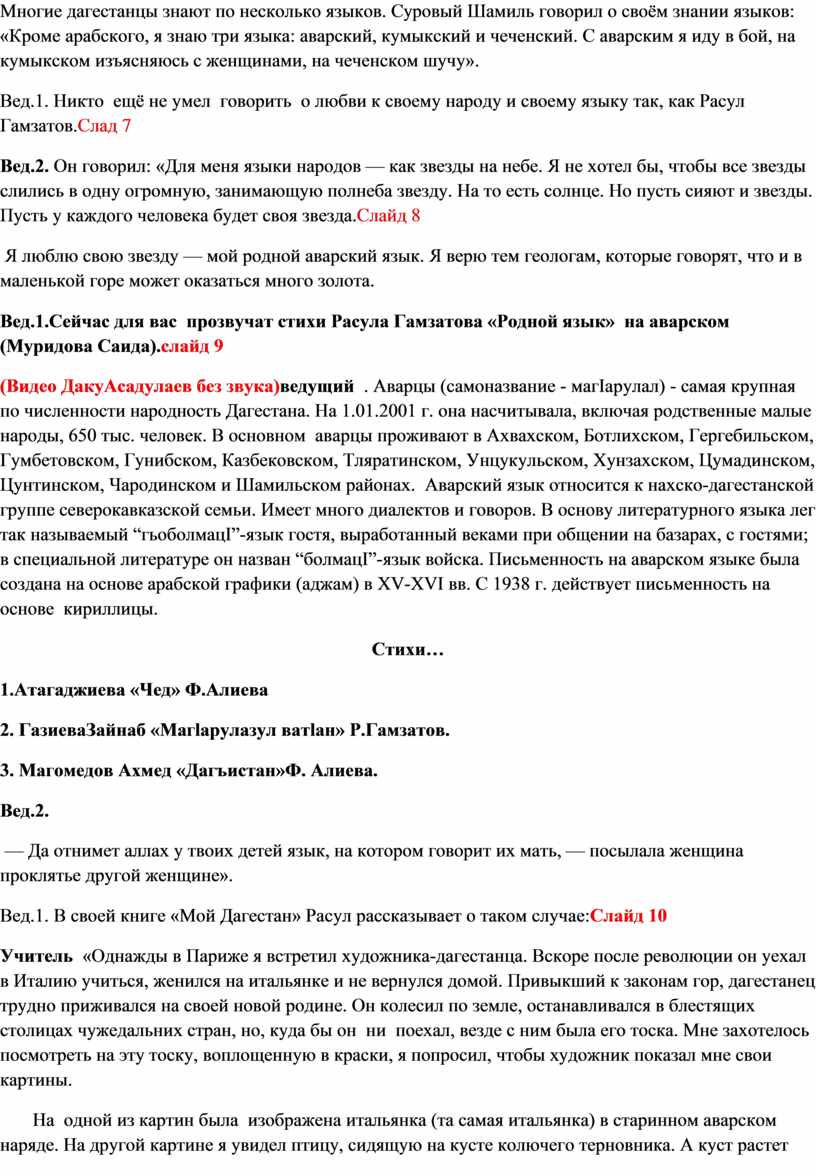 Вед.1.Сейчас для вас прозвучат стихи Расула Гамзатова «Родной язык» на аварском (Муридова Саида).слайд 9