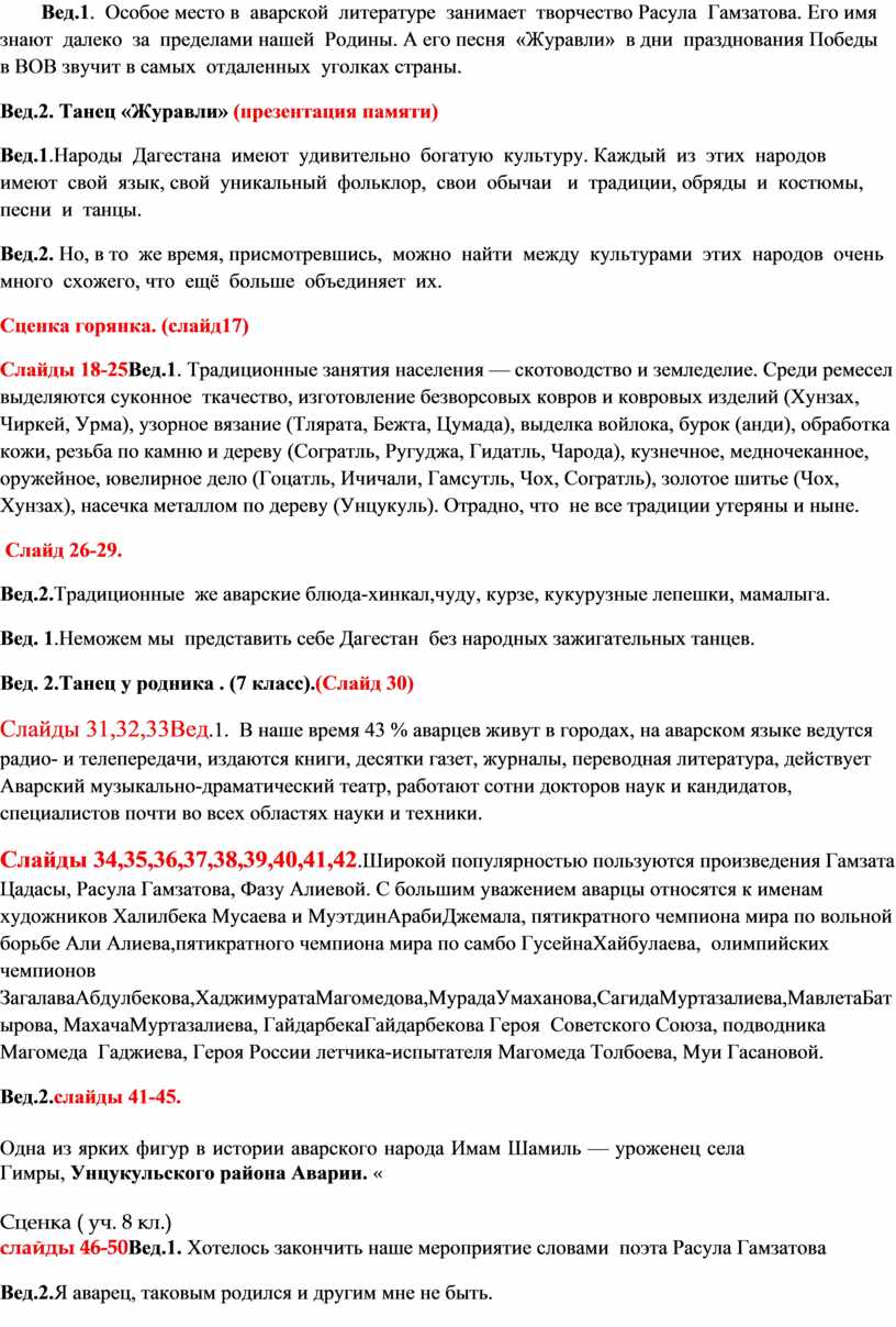 Вед.1. Особое место в аварской литературе занимает творчество Расула Гамзатова. Его имя знают далеко за пределами нашей Родины. А его песня «Журавли» в дни празднования Победы в ВОВ звучит в самых отдаленных уголках страны.
