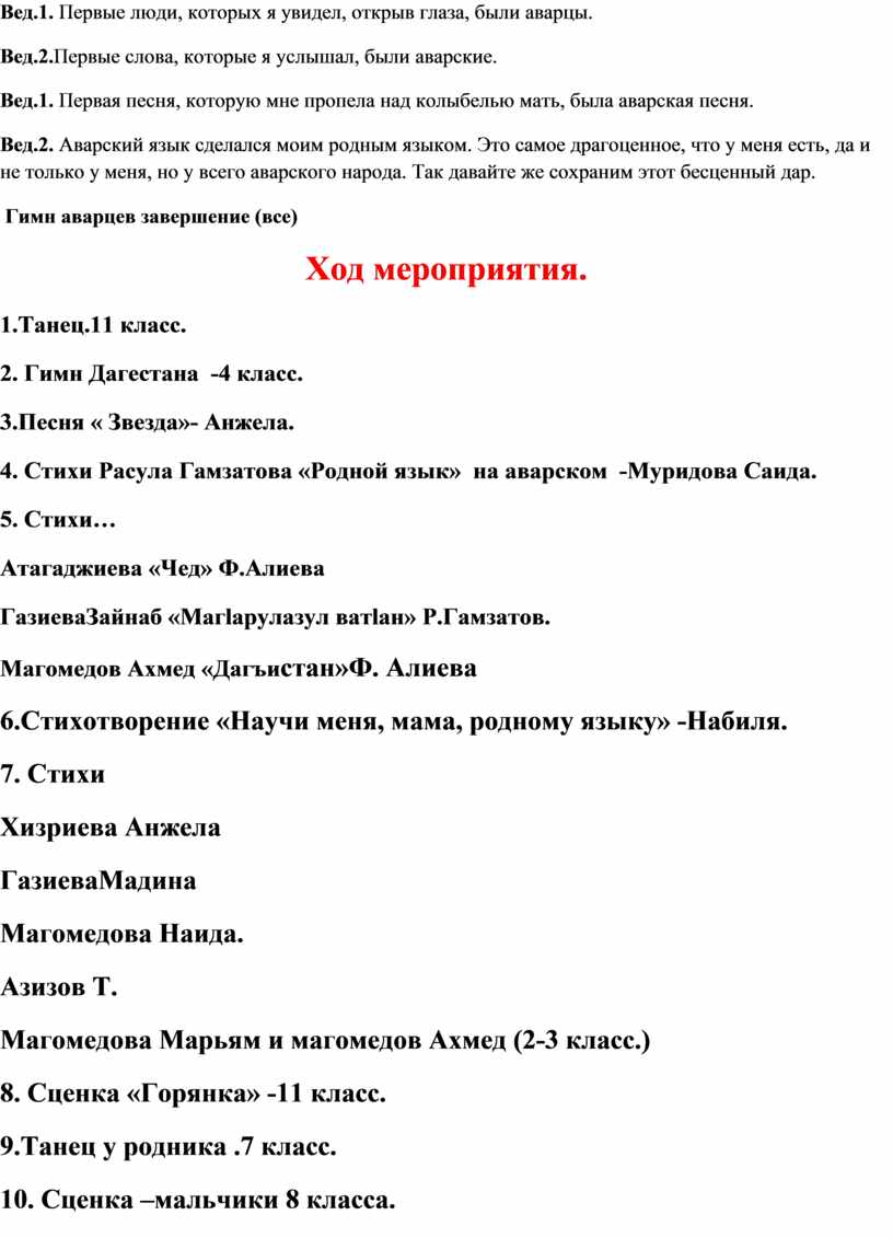 Вед.2. Аварский язык сделался моим родным языком. Это самое драгоценное, что у меня есть, да и не только у меня, но у всего аварского народа. Так давайте же сохраним этот бесценный дар.