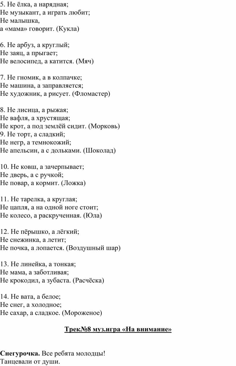 Дед Мороз. Загадаю вам ребятки очень трудные загадки, отгадаешь, не зевай – дружно хором отвечай. А загадки мои не простые, кто отгадает тому приз