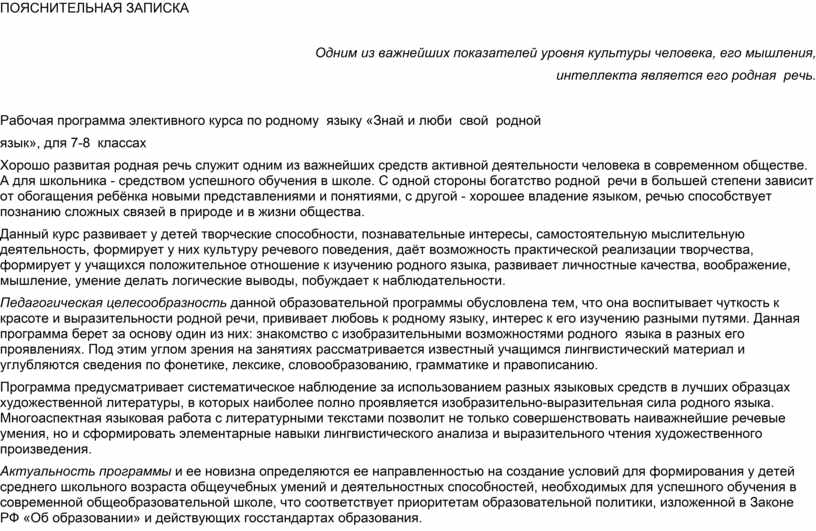 Рабочая программа элективного курса по родному языку «Знай и люби свой родной