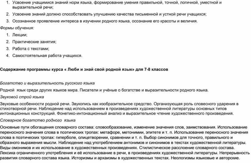 Содержание программы курса « Люби и знай свой родной язык» для 7-8 классов