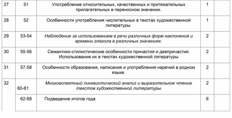 Особенности употребления числительных в текстах художественной литературы. Наблюдение за использованием в речи различных форм наклонения и времени глагола в различных значениях. Семантико-стилистические особенности причастия и деепричастия; использование их в текстах художественной литературы. Особенности образования, написания и употребления наречий в родном языке. Роль служебных частей речи в семантико-стилистическом оформлении художественного текста. Многоаспектный лингвистический анализ и выразительное чтение текстов художественной литературы.