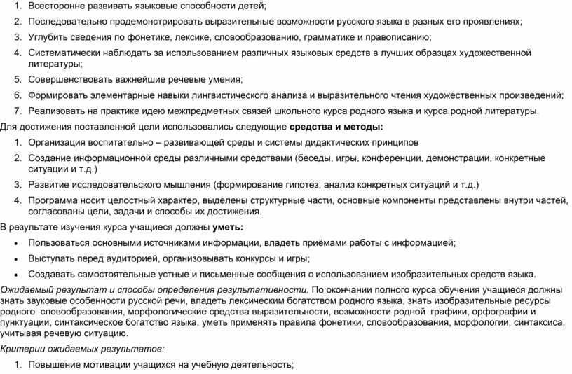 Ожидаемый результат и способы определения результативности. По окончании полного курса обучения учащиеся должны знать звуковые особенности русской речи, владеть лексическим богатством родного языка, знать изобразительные ресурсы родного словообразования, морфологические средства выразительности, возможности родной графики, орфографии и пунктуации, синтаксическое богатство языка, уметь применять правила фонетики, словообразования, морфологии, синтаксиса, учитывая речевую ситуацию.