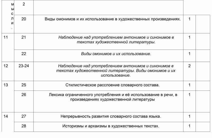 Основные пути обогащения словарного состава: словообразование, изменение значения слов, заимствования. Использование переносного значения слова в поэтических тропах: метафоре, метонимии, эпитете и т. п. Использование переносного значения слова в поэтических тропах: гиперболе, олицетворении, сравнении и т. п. Выбор синонимов для точного, правильного и образного выражения мысли. Наблюдение над употреблением антонимов и синонимов в текстах художественной литературы. Виды омонимов и их использование в художественных произведениях. Стилистическое расслоение словарного состава. Лексика ограниченного употребления и её использование в речи, в произведениях художественной литературы. Непрерывность развития словарного состава языка. Историзмы и архаизмы в художественных текстах. Неологизмы языковые и авторские. Фразеологизмы. Крылатые слова, пословицы и поговорки; их использование в художественной литературе. Звуковой, интонационный, лексический анализ и выразительное чтение произведений художественной литературы.