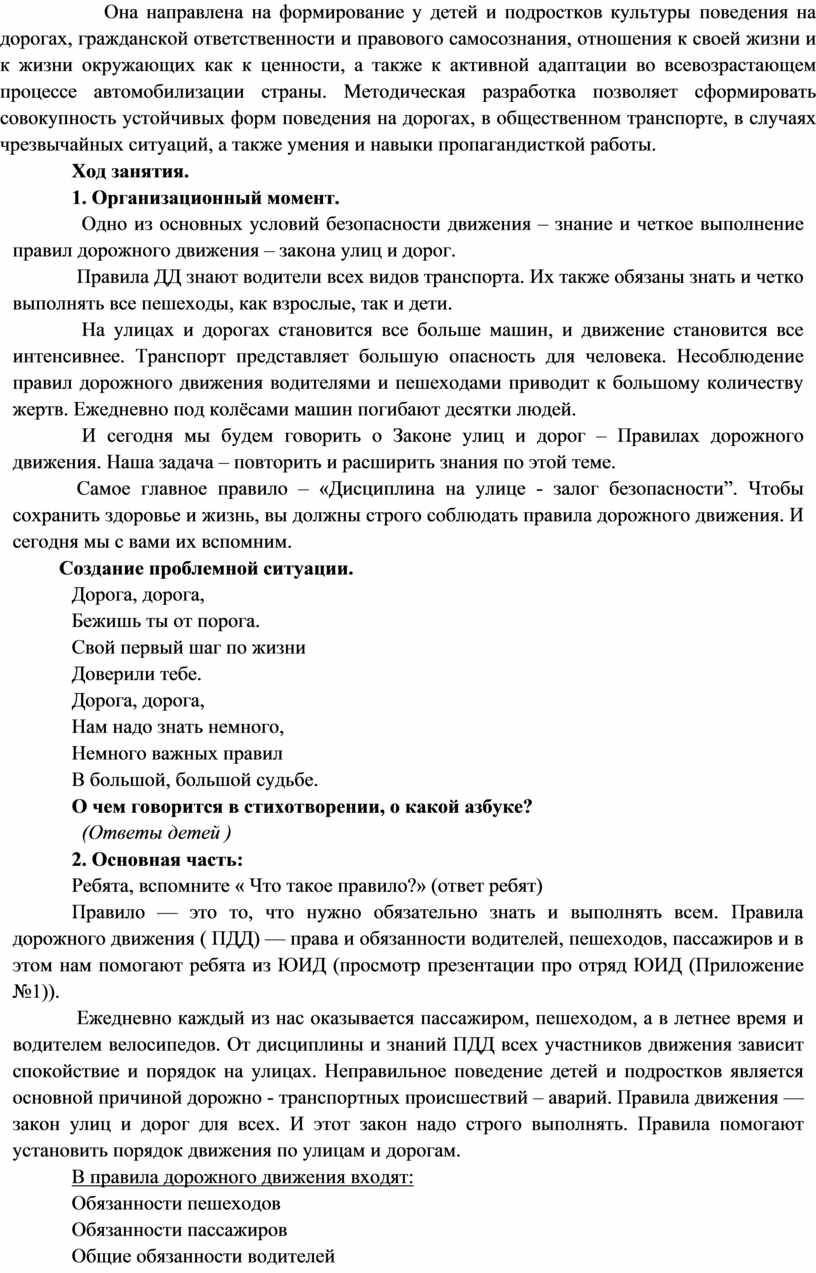 Она направлена на формирование у детей и подростков культуры поведения на дорогах, гражданской ответственности и правового самосознания, отношения к своей жизни и к жизни окружающих как к ценности, а также к активной адаптации во всевозрастающем процессе автомобилизации страны. Методическая разработка позволяет сформировать совокупность устойчивых форм поведения на дорогах, в общественном транспорте, в случаях чрезвычайных ситуаций, а также умения и навыки пропагандисткой работы.
