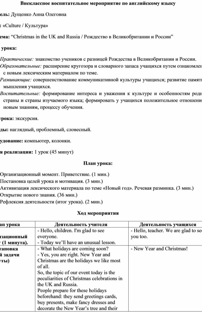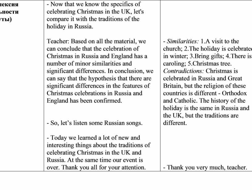 Teacher: Based on all the material, we can conclude that the celebration of Christmas in Russia and England has a number of minor similarities and significant differences. In conclusion, we can say that the hypothesis that there are significant differences in the features of Christmas celebrations in Russia and England has been confirmed.