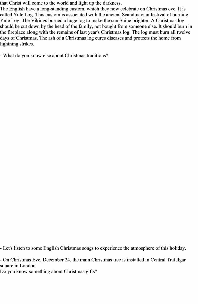 - Yes, Christmas and the Christmas holiday cycle are the biggest festive event of the year in England. Christmas in England is preceded by Advent-preparation for Christmas (December 1-24). One of the main traditions of the preparatory weeks is wreaths with candles. These wreaths are made for the first Sunday, and consist of 5 candles - four red and one white. A new red candle is lit every Sunday. They are lit at a time when the family gathers together for prayer. A white candle is lit on the evening before Christmas as a symbol that Christ will come to the world and light up the darkness. The English have a long-standing custom, which they now celebrate on Christmas eve. It is called Yule Log. This custom is associated with the ancient Scandinavian festival of burning Yule Log. The Vikings burned a huge log to make the sun Shine brighter. A Christmas log should be cut down by the head of the family, not bought from someone else. It should burn in the fireplace along with the remains of last year's Christmas log. The log must burn all twelve days of Christmas. The ash of a Christmas log cures diseases and protects the home from lightning strikes.