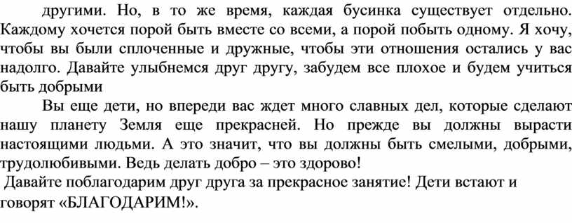 – Наш разговор подходит к концу. Возьмите свои бусинки, сожмите в кулачок и приложите к сердцу. Подумайте, что вы возьмете с собой в жизнь с этого занятия. Пусть этот опыт поможет вам быть в жизни добрее и терпимее друг к другу, помогает находить то доброе и хорошее, что есть в душе каждого человека. Давайте каждую бусинку будем нанизывать на одну нитку. Посмотрите, какие чудесные получились бусы у нас. Вот так мы связаны с другими. Но, в то же время, каждая бусинка существует отдельно. Каждому хочется порой быть вместе со всеми, а порой побыть одному. Я хочу, чтобы вы были сплоченные и дружные, чтобы эти отношения остались у вас надолго. Давайте улыбнемся друг другу, забудем все плохое и будем учиться быть добрыми