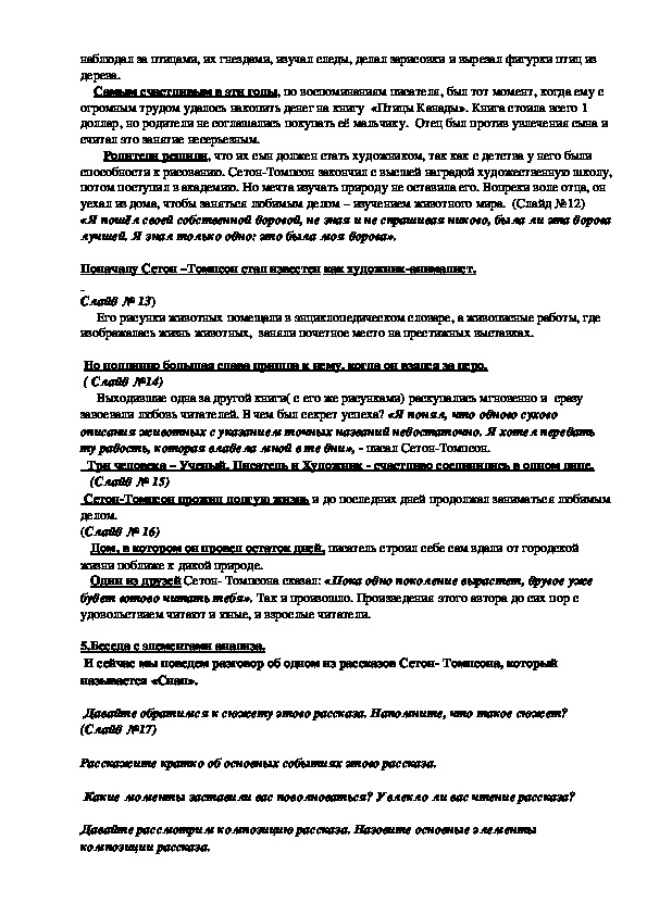 Оборудование: книги Э. СетонТомпсона, слайды, иллюстрирующие жизненный путь