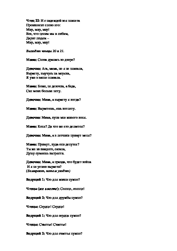 Мир, мир, мир!Чтец 22: И с надеждой вся планета