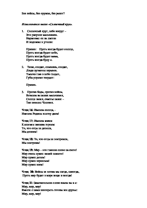 Ведущий 2: Что для счастья нужно?Чтецы: Мир! Мир!