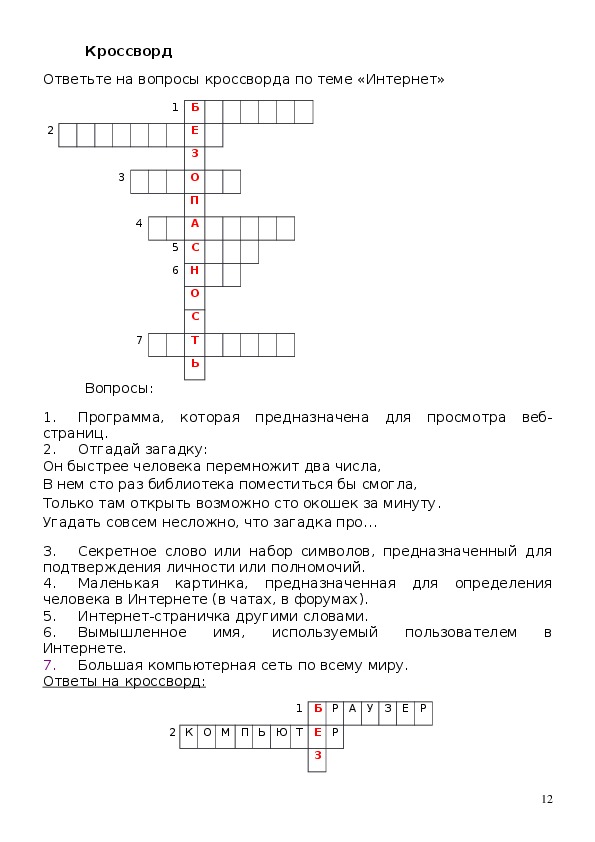 Ответьте на вопросы кроссворда по теме «Интернет»