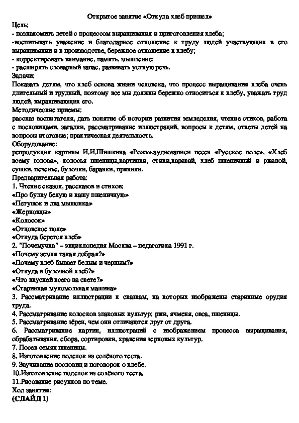 2015 годОткрытое занятие «Откуда хлеб пришел»