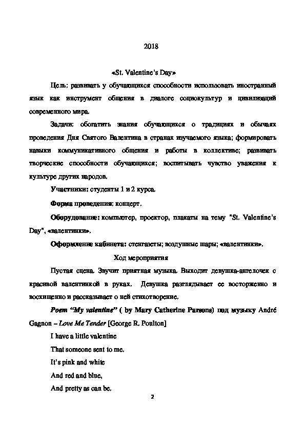Данное мероприятие разработано с целью раскрытия, развития творческих способностей обучающихся. Был организован мини-концерт, где студенты представили традиции, обычаи и легенды происхождения этого праздника, одну из которых они показали наглядно, а также исполняли песни как на русском, так и на английском языках. Мероприятие постарались разнообразить презентацией, стихами на английском языке, видеороликом, и, конечно же, раздачей «валентинок».