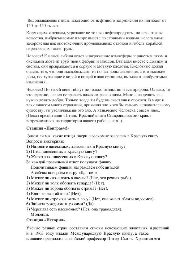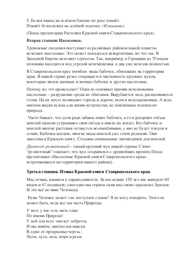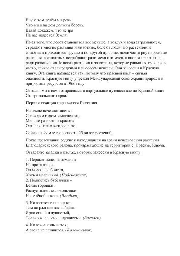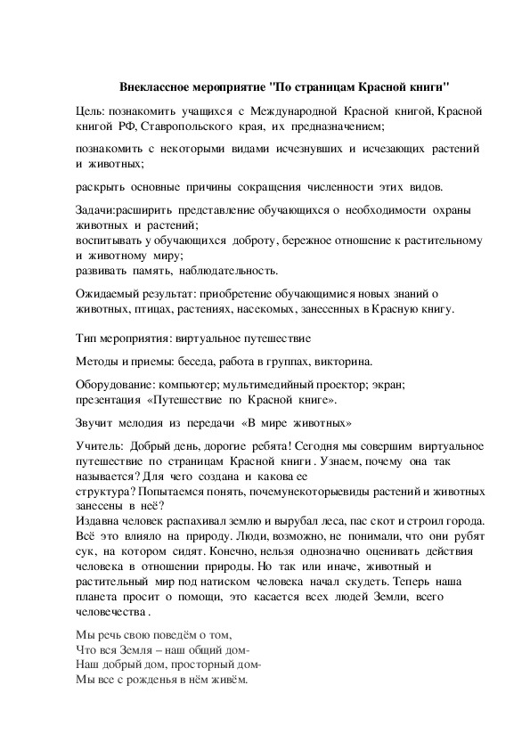 Мероприятие посвящено Году экологии, в форме путешествия по страницам Красной книги Ставропольского края. Рассматривались страницы: животные, растения, проводилась викторина. также ребята получали задания- создать свою Красную книгу(на столах были фотографии животных и растений),написать обращение к человеку о бережном отношении к природе.