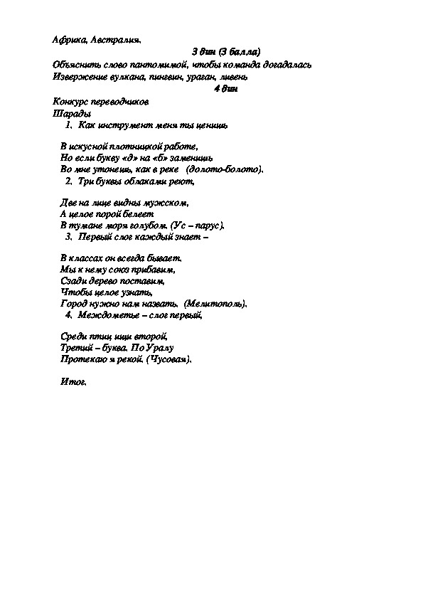 1-я команда (5-6 человек) получает слово (карточку берет, не глядя, капитан) и объясняет команде, не называя слова так, чтобы они догадались. За правильно угаданное слово – 2 балла.