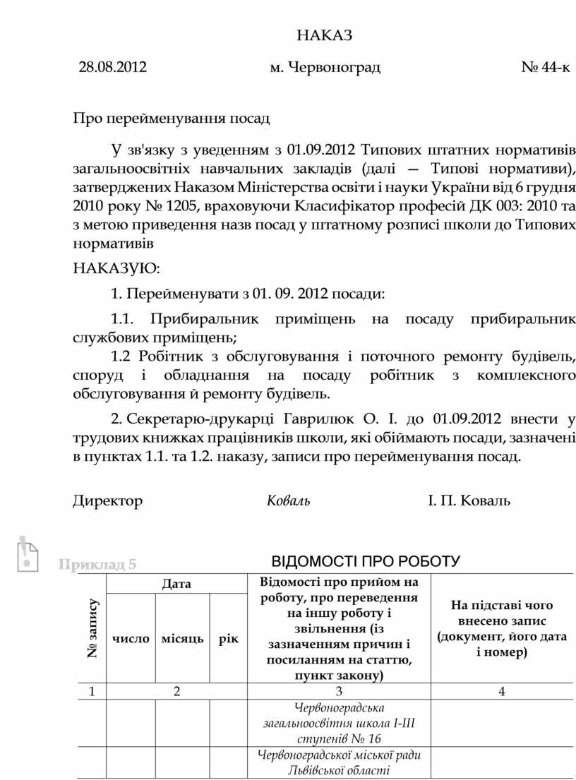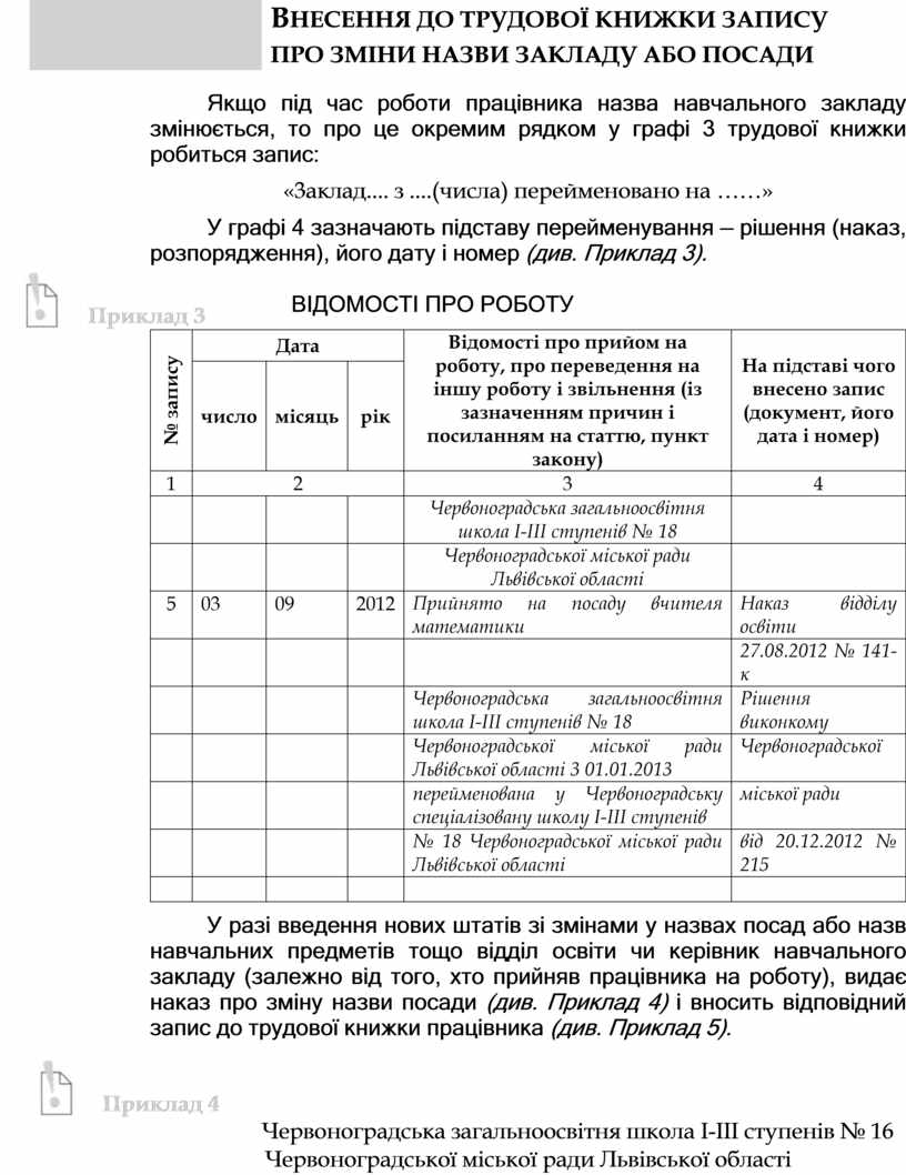 У разі введення нових штатів зі змінами у назвах посад або назв навчальних предметів тощо відділ освіти чи керівник навчального закладу (залежно від того, хто прийняв працівника на роботу), видає наказ про зміну назви посади (див. Приклад 4) і вносить відповідний запис до трудової книжки працівника (див. Приклад 5).