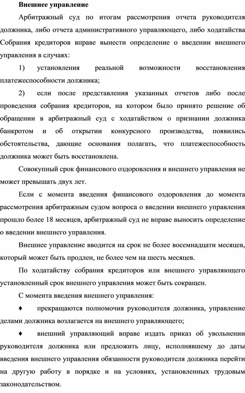 ♦ прекращаются полномочия руководителя должника, управление делами должника возлагается на внешнего управляющего;