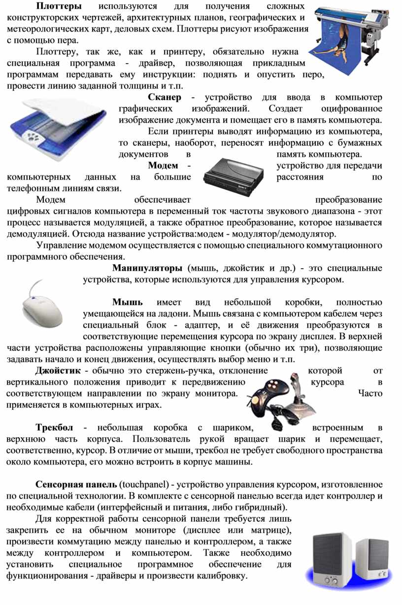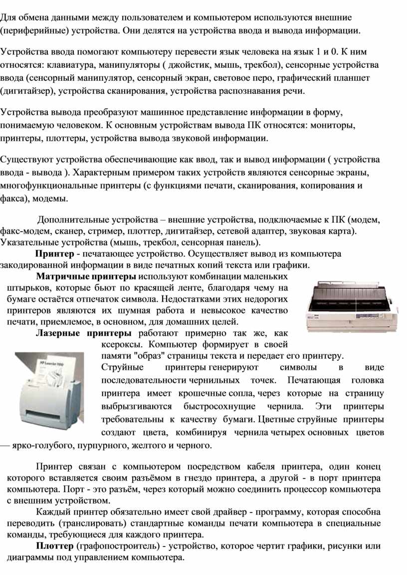 Для обмена данными между пользователем и компьютером используются внешние (периферийные) устройства. Они делятся на устройства ввода и вывода информации.
