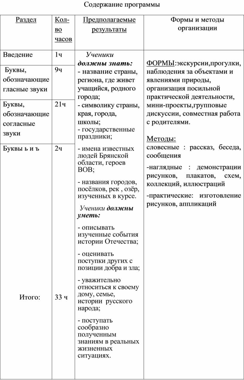 Ученики должны знать: - название страны, региона, где живет учащийся, родного города; - символику страны, края, города, школы; - государственные праздники; - имена известных людей Брянской области, героев ВОВ; - названия городов, посёлков, рек , озёр, изученных в курсе. Ученики должны уметь: - описывать изученные события истории Отечества; - оценивать поступки других с позиции добра и зла; - уважительно относиться к своему дому, семье, истории русского народа; - поступать сообразно полученным знаниям в реальных жизненных ситуациях.
